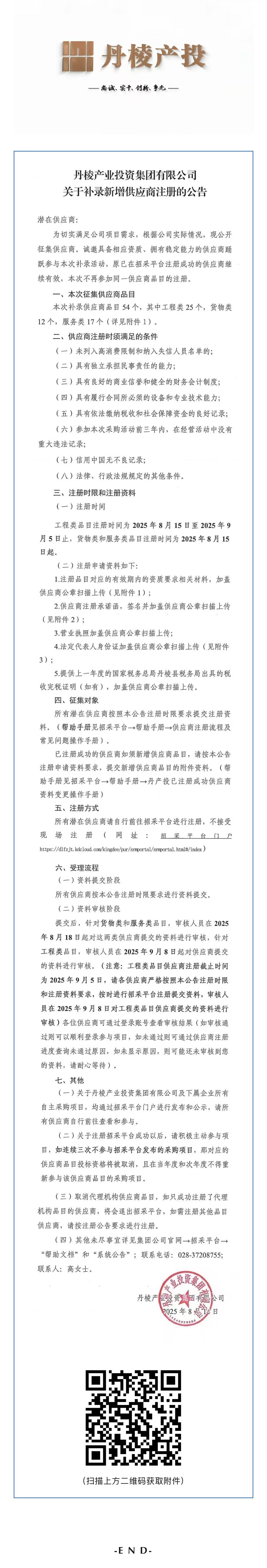 丹棱產業(yè)投資集團有限公司關于補錄新增供應商注冊的公告